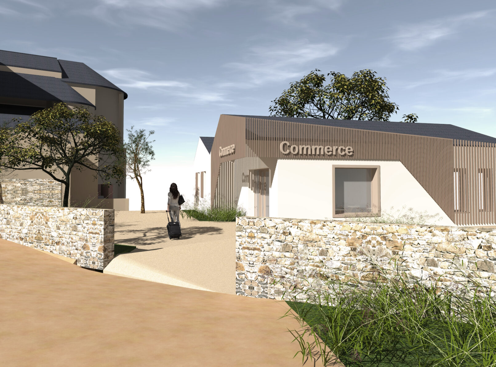 Le projet prévoit la création d’une cellule commerciale destinée à accueillir un bar/restaurant. L’architecture se veut modeste et vertueuse, en cohérence avec les ambitions environnementales de la commune, notamment l’atteinte du niveau E3 du label E+C-. L’assiette foncière sera réaménagée afin d’optimiser la visibilité des commerces depuis les principales voies et carrefours.