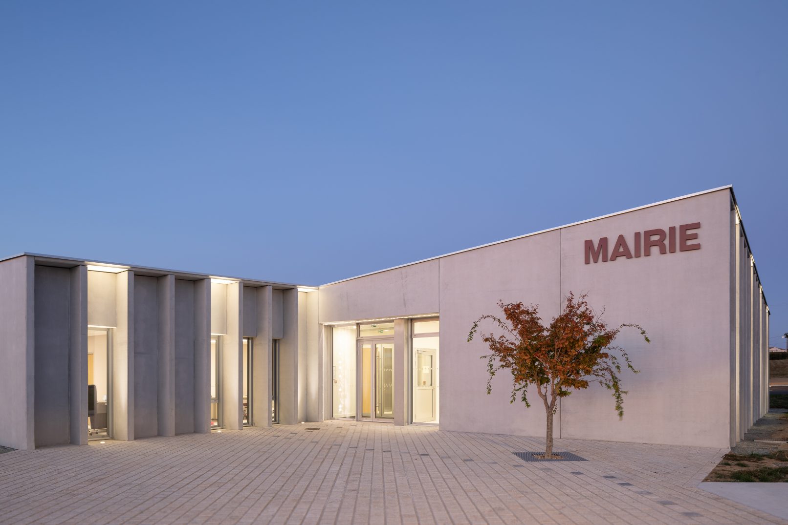 La nouvelle mairie du centre-bourg de la Meilleraie-Tillay (Vendée) organise les flux vers les équipements locaux situés dans sa périphérie; elle tient aujourd’hui le rôle de signal sur la route principale. Ce bâtiment de plain-pied se compose de deux parallélépipèdes, sous une toiture en pente douce aux contours à peine marché.
