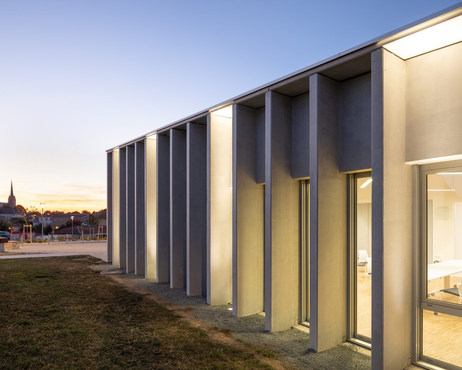 Les épines en béton soulignent une géomètre rigoureuse. L’intention architecturale est intimement liée aux choix constructifs, argumentés par un souhait du maître d’ouvrage de minimiser l’entretien du bâtiment et également l’impact sonore durant toute la phase travaux.