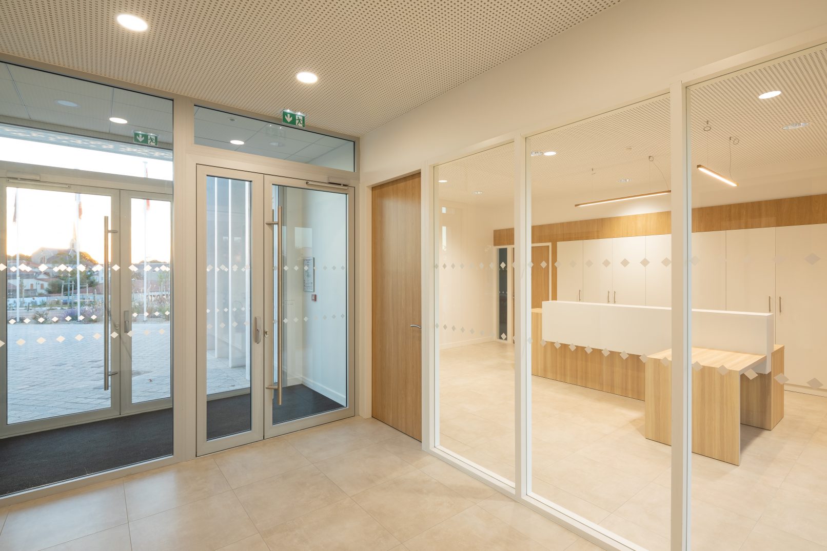Le hall dessert directement et simplement les deux entités: à droite, le bureau de poste et la salle de conseil et de mariage avec sa tisanerie attenante; à gauche l’accueil plus confidentiel du public. les aménagements intérieurs sont en mélaminés blanc associé au bois, les finitions sont simples et soignées .