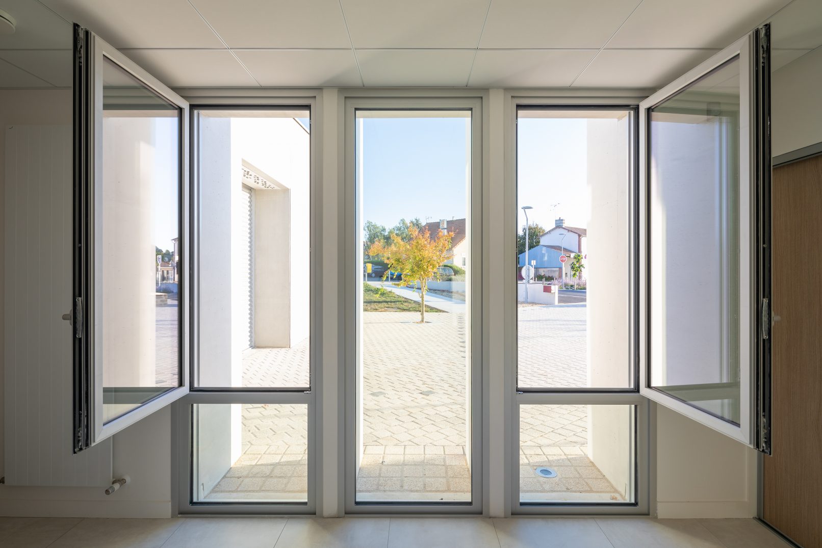 Leur jonction en angle crée un parvis public minérale qui désigne l’entrée principale. le caractère institutionnel des lieux est affirmé par un béton clair et des façades rythmées de refends en béton au sud.